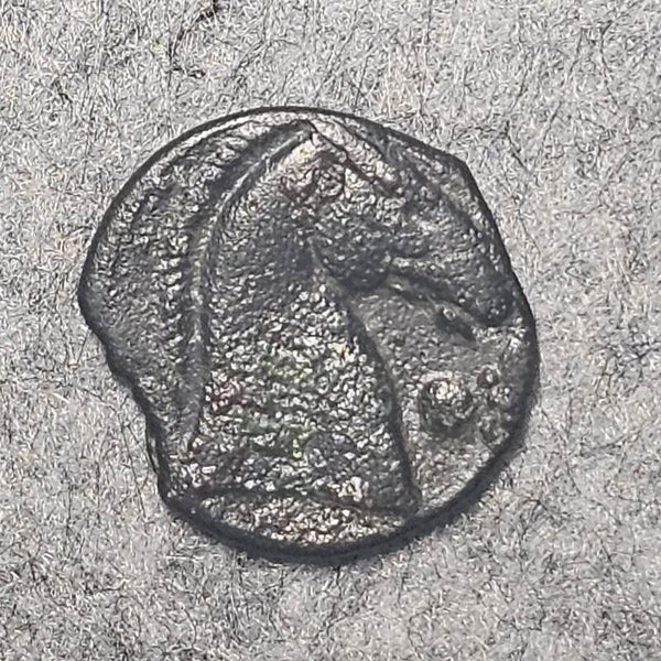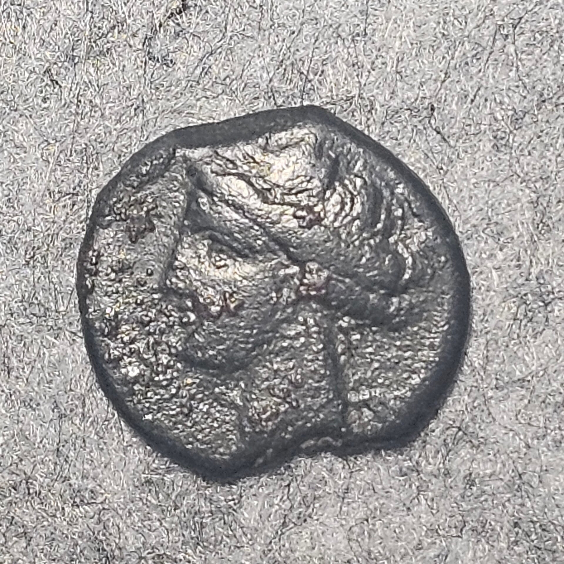Tête de Tanit à gauche, couronnée d’épis avec collier et boucles d’oreille ; derrière le buste, le bandeau du collier.