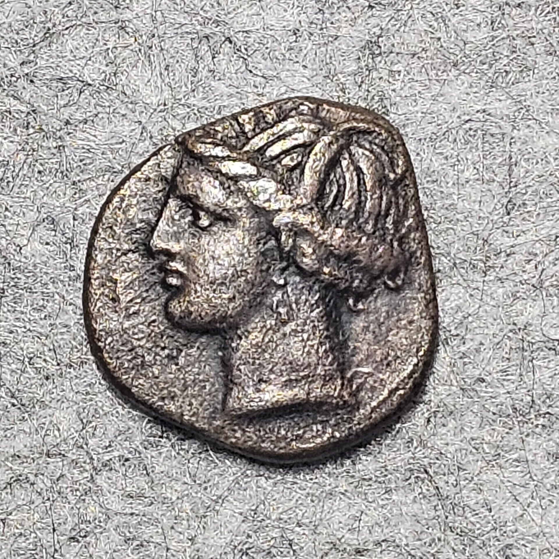 Tête de Tanit à gauche, couronnée d’épis avec collier et boucles d’oreille.