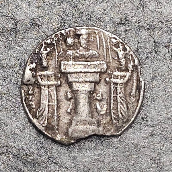 Buste de Shapur II à droite, portant une couronne murale avec korymbos et ruban intérieur.