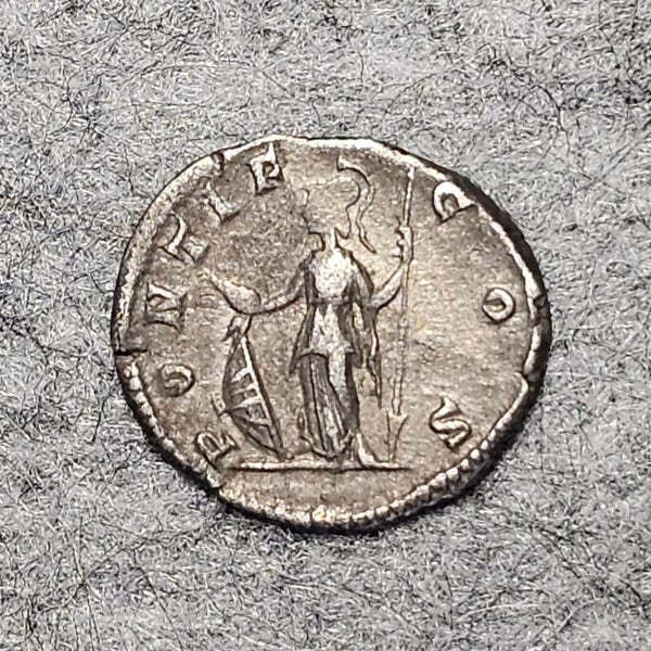Minerve, casquée, drapée, debout à gauche, appuyée sur un écu, tenant une lance dans la main droite.